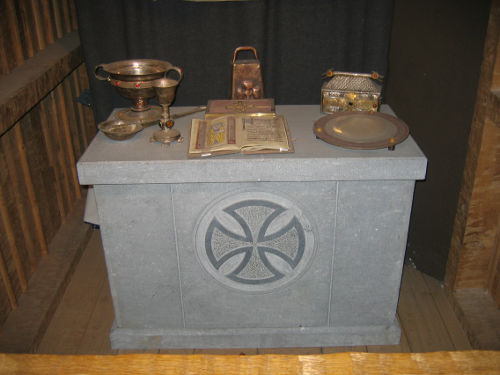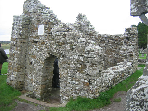 On site there is the little 8C ‘house’ where he was probably buried. There are some fine high crosses, on one of which, known as the Cross of the Scriptures, contains a picture of him driving in the foundation stake of the monastery. The monastery became one of the most important centres of learning and religious life in Ireland. It survived many attacks from the Vikings and kept going to the Reformation. There is a holy well. In the museum is picture of what an altar of the time looked like.