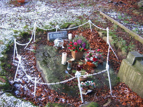 St Monnina (Darerca) was baptised, confirmed amd given the veil by St Patrick. She founded a place to live with her companions at Killeevy on the slopes of Slieve Gullion in Co Armagh in 450. Her name may mean ‘My Ninian’ reflecting a possible connection with Whithorn in Scotland. She was a great lover of the poor. Her grave can be found in the graveyard. There is a holy well on the mountain side above.