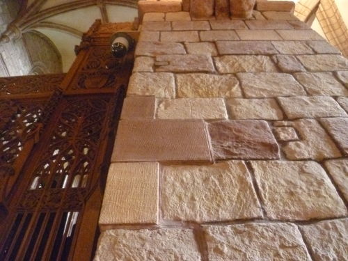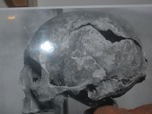 In 1917 his bones were found hidden in a cavity in a column in the cathedral. The place is marked by a cross on the stone in the very middle of the picture. His battered skull is now in the museum.