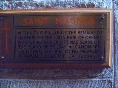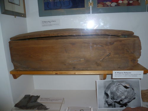 St Magnus was struck on the head with an axe by one of his brother’s henchmen and died for trying to defuse a power struggle. He was regarded as a martyr. His bones were taken to the new cathedral in Kirkwall on mainland Orkney on his memory.