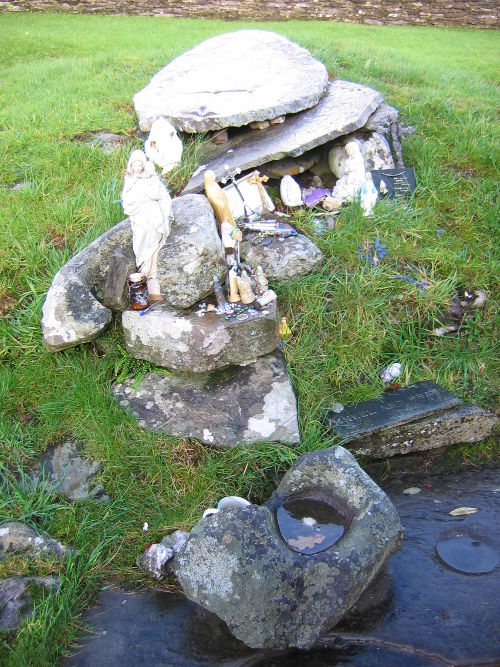 St Gobnet is an extremely popular saint in Co Cork. Her circular hut often referred to as her ‘house’ or ’kitchen can be seen in the village; her grave is nearby and her holy well. A cross slab has a remarkable figure of a pilgrim on it.